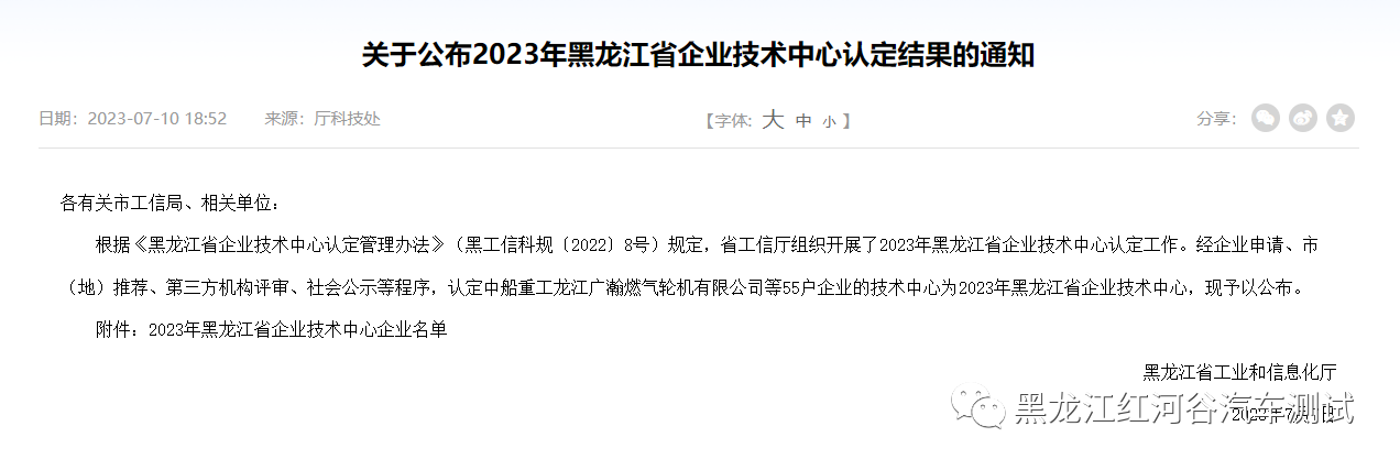 2023年7月7日,黑龙江省工业和信息化厅发布了《关于公布2023年黑龙江省企业技术中心认定结果的通知》,根据《黑龙江省企业技术中心认定管理办法》(黑工信科规〔2022〕8号)的规定,黑龙江省工信厅组织开展了“2023年黑龙江省企业技术中心”认定工作。经企业申请、市(地)推荐、第三方机构评审、社会公示等程序,认定黑龙江红河谷汽车测试股份有限公司等55户企业的技术中心为2023年黑龙江省企业技术中心。
