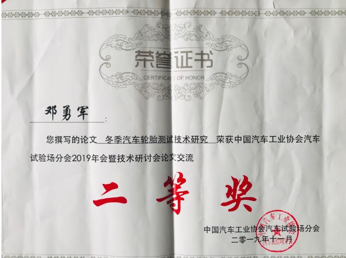 本月7日-8日,中国汽车工业协会汽车试验场分会2019年会暨技术研讨会在重庆圆满召开。由黑龙江红河谷汽车测试股份有限公司创作的《冬季汽车轮胎测试技术研究》论文报告,获评本届年会优秀论文二等奖。